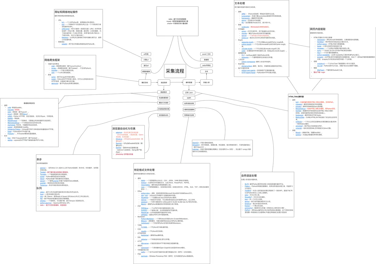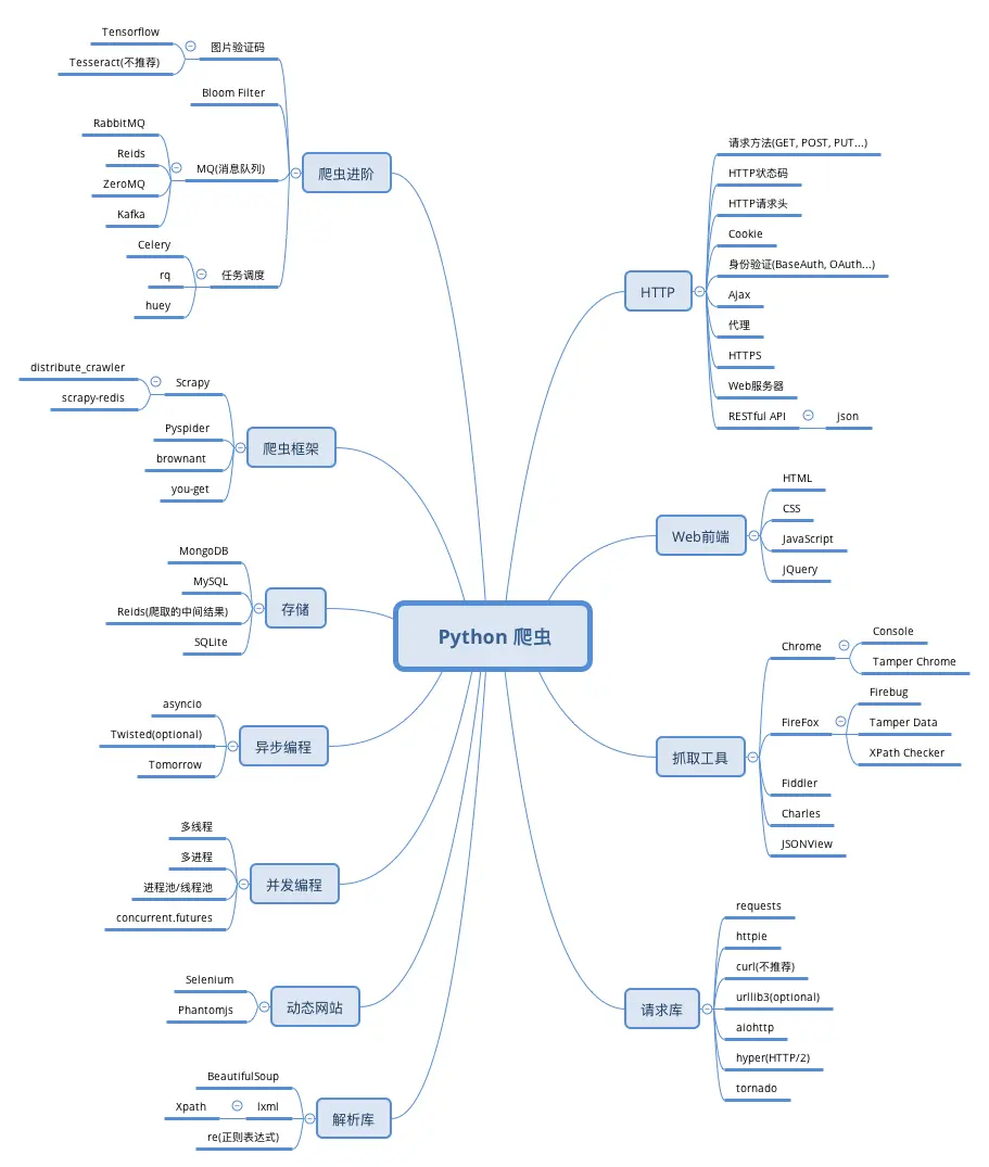 在python微信群里说过会分享看过的两个python爬虫技能树(思维导图),这回算是填个坑。