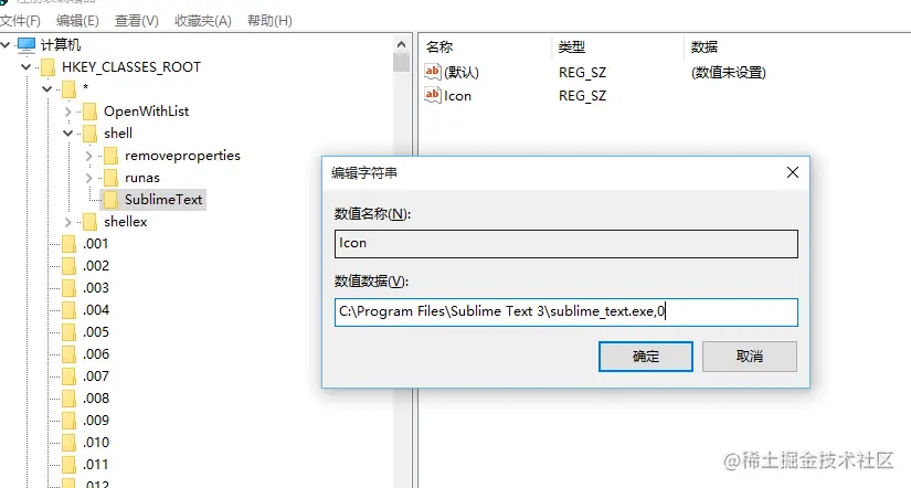 3. 右键SublimeText项,新建字符串值,命名为Icon,值为 “sublime_text.exe所在路径,0”,例如:C:\Program Files\Sublime Text 3\sublime_text.exe,0