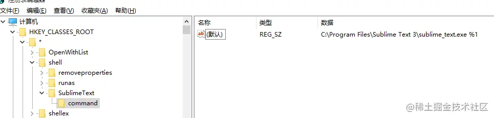 4. 右键SublimeText项,新建项,命名为command,默认值为 “sublime_text.exe所在路径 %1”,例如:C:\Program Files\Sublime Text 3\sublime_text.exe %1