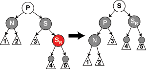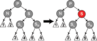 N的新叔父,S的右儿子.那么它以前通过S、S的父亲和S的右儿子,但是现在只通过S,它被假定为它以前的父亲的颜色,和S的右儿子,它被从红色改变为黑色.合成效果是这个路径通过了同样数目的黑色节点.