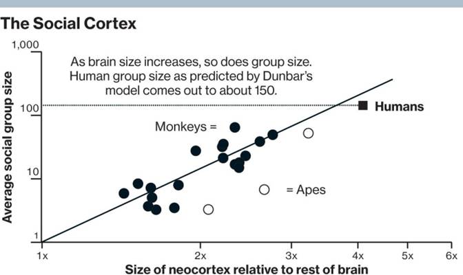 Mike还举了一个非常有意思的理论,叫“Dunbar Number”,这是一个叫Dunbar(废话)生物学家在1992年最早提出来的。最初,他发现灵长类的大脑容量和其对应的族群大小有一定关联,进而推断出人类的大脑能维系的关系的一些有趣估计。举例来说