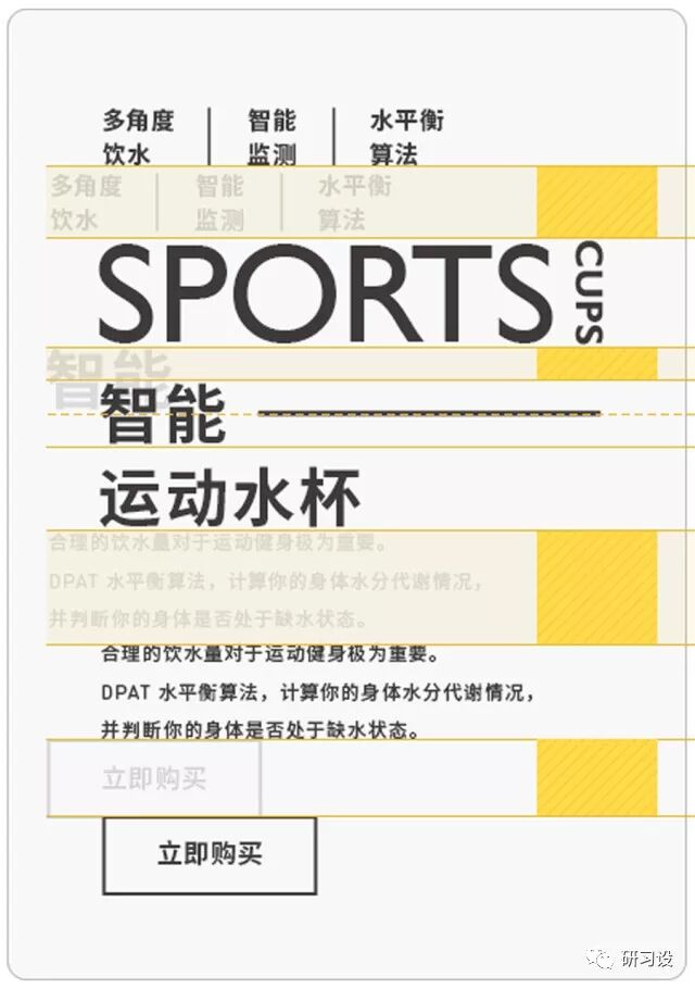 上图中,黄色区域是标注好的留白面积,图标与文字等距排列。所有元素都链接到了一起,抛开我们的视觉经验,单从元素的位置与关系来说,我们并没有办法分清哪些文字与哪些图标存在联系。