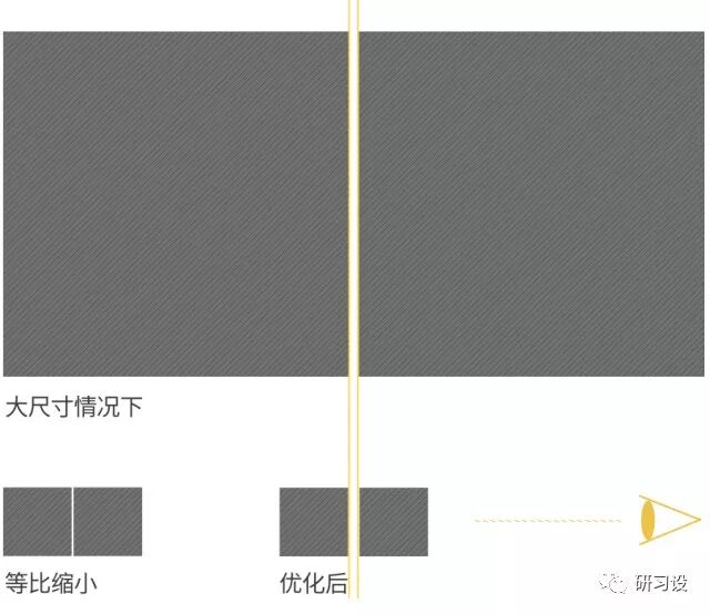 无论元素如何放大与缩小,人眼能够识别到的最小比例是不会跟着改变的。上图中方块间的距离在大比例的情况下不会显得有什么问题,当等比缩小后方块间几乎黏在了一起,这种情况下我们需要重新调整方块之间的距离。