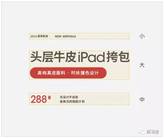 通过阅读文案信息得知,这个版面想传递的重要概念应该是产品名称,其次是价格信息,再然后是“夏季新款”等信息。 将文字的层级划分好后,调整留白间距,区分出关联性不强的信息组合。