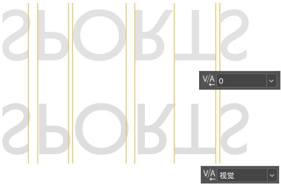 拉丁字母与汉字不同,字体的字面是不等宽的,所以我们需要单独设置每个文字之间的留白距离,分别比对字体默认的字偶间距与软件自带的视觉间距(这里为了不被字意干扰,我们将字体镜像显示),两种设置均不是特别理想。