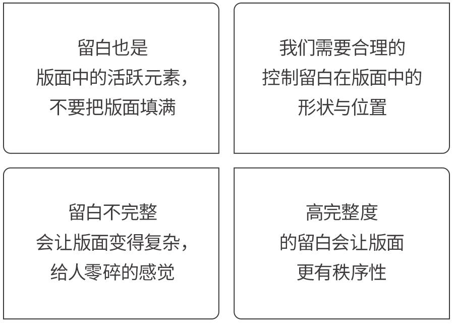 留白在版式设计的各个环节中都扮演着重要角色,我们本期学习了留白的作用与注意事项,了解了从字距的设置到整个版面的布局中的留白细节,相信大家已经掌握了比例与留白之间的关系,并能够在今后的设计当中加以运用。