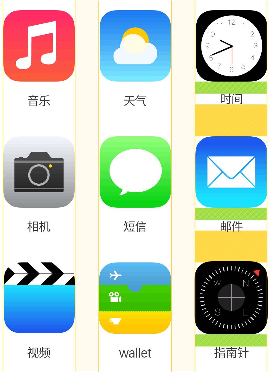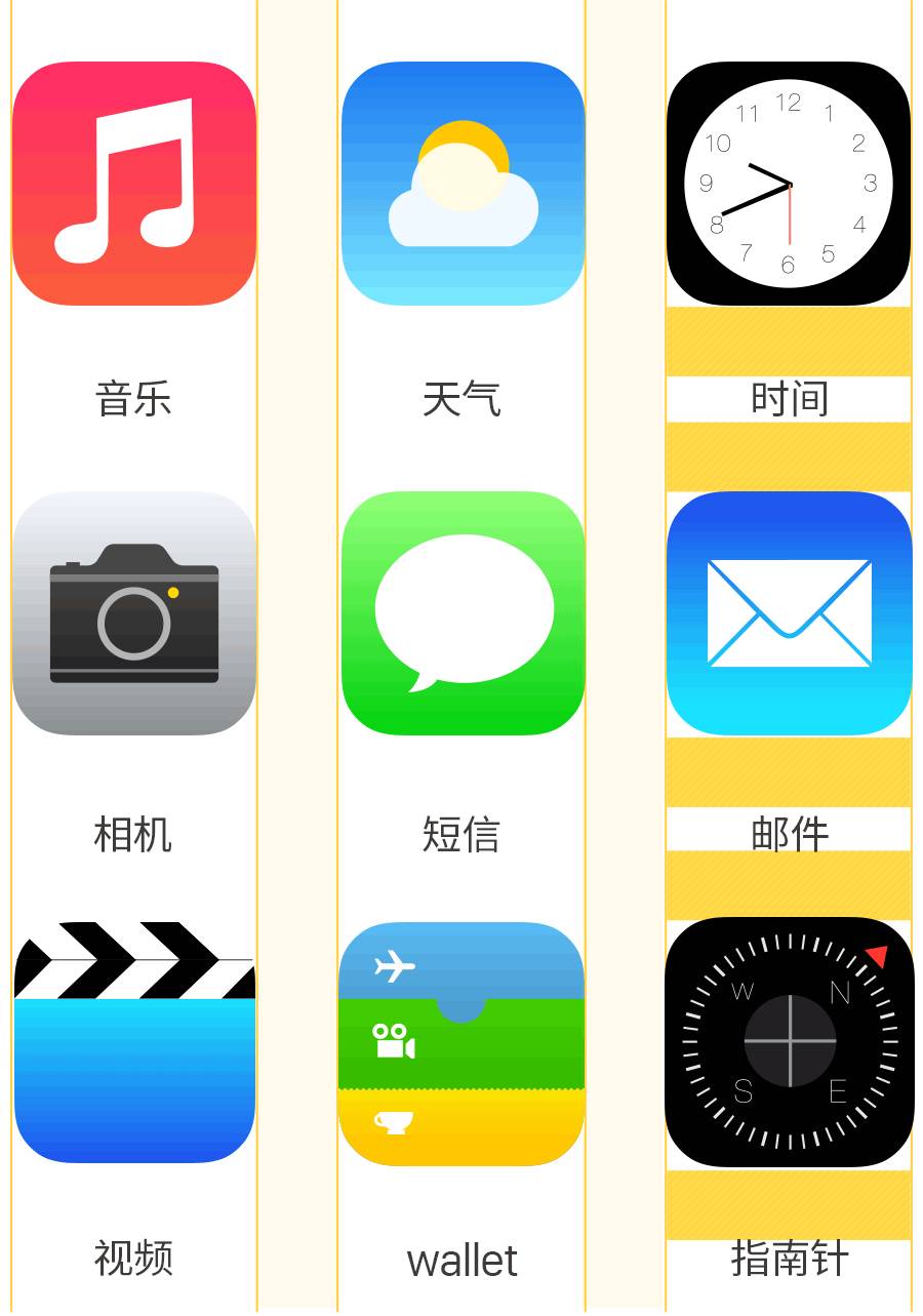 均等的留白能够将元素链接在一起,会传递出统一感和平稳感,通过控制留白的面积大小关系,则可以将不相关的元素区分开来。接下来我们以生活中常见的手机图标为例,来解释留白中区分与链接的应用。