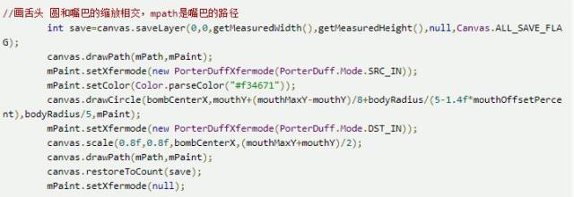 其实就是一个圆然后再加上一个路径图就可以实现,红点表示的是控制点。空心点表示节点。细心的朋友可能发现,不对啊。舌头下面不全是红的,和嘴巴是分开的。这里只需要把嘴巴按比例缩小,然后和嘴巴做个Xfermode就可以了。部分代码: