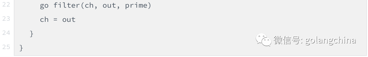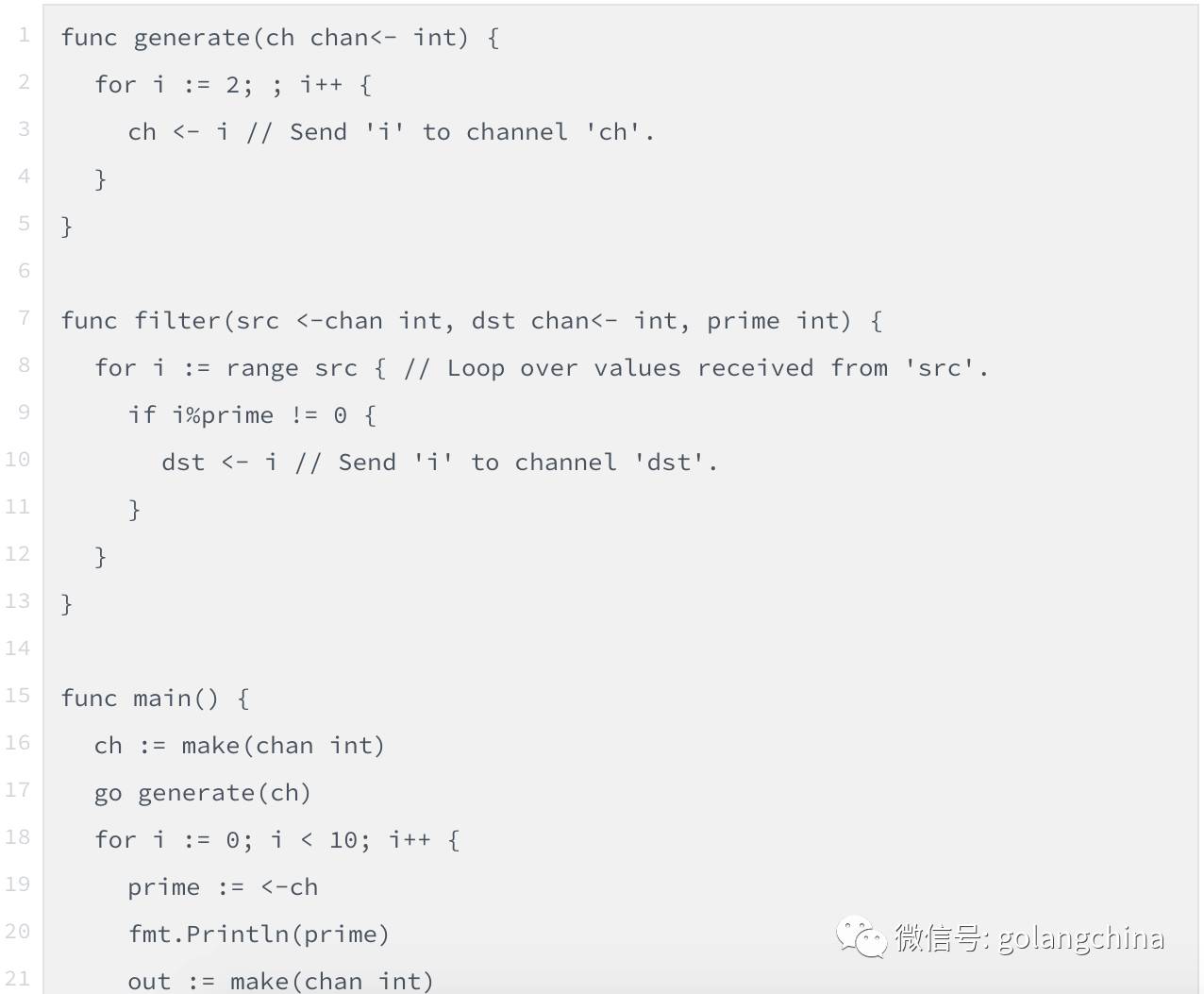 这个算法的并发变化是用 goroutines 来过滤数字 —— 一个 goroutine 发现一个素数,而 channels 用来把数字从 generator 传递到 filter。当一个素数被找到了,就会通过 channel 传递给 main,再输出。