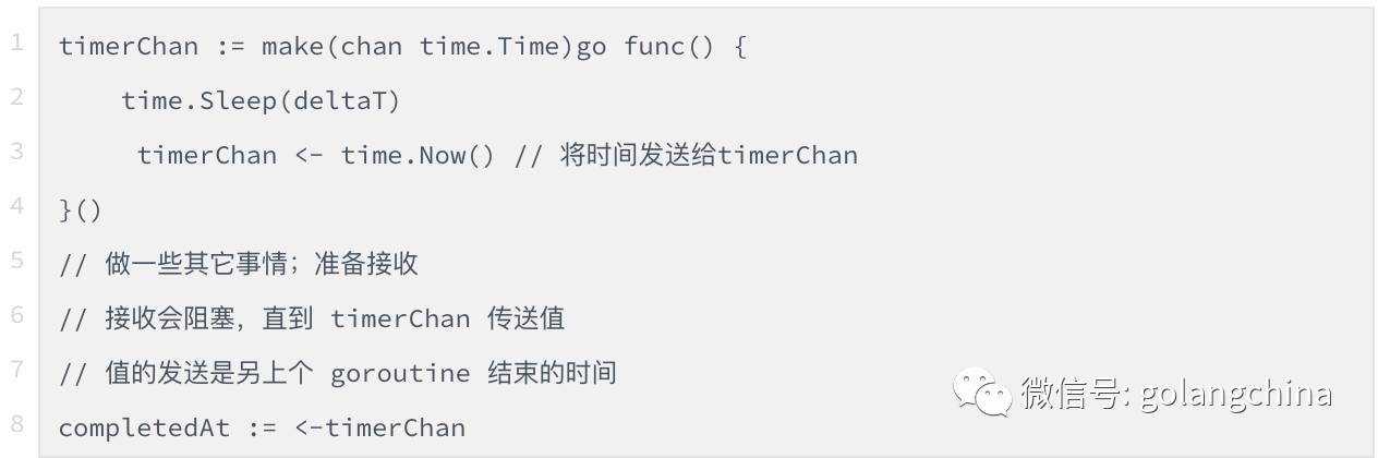 记得在前面讲Channel举的一个计时器的例子,也非常典型 - 创建一个 channel,启动一个 goroutine,在给定的时间间隔之后向这个 channle 写入数据,之后将这个 channel 返回给函数的调用着。这个调用者会阻塞固定的时间后去读取该 channel。让我们来运行 24 个这样的计时器并试着做可视化。
