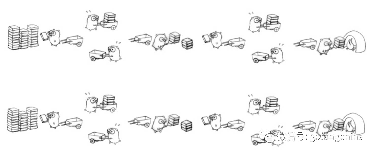 想了解并行和并发的区别,推荐看一下Rob Pike的分享(点击阅读原文即可跳转)。在这个视频里,他用形象的Gopher动图,讲解了Go并发的过程。