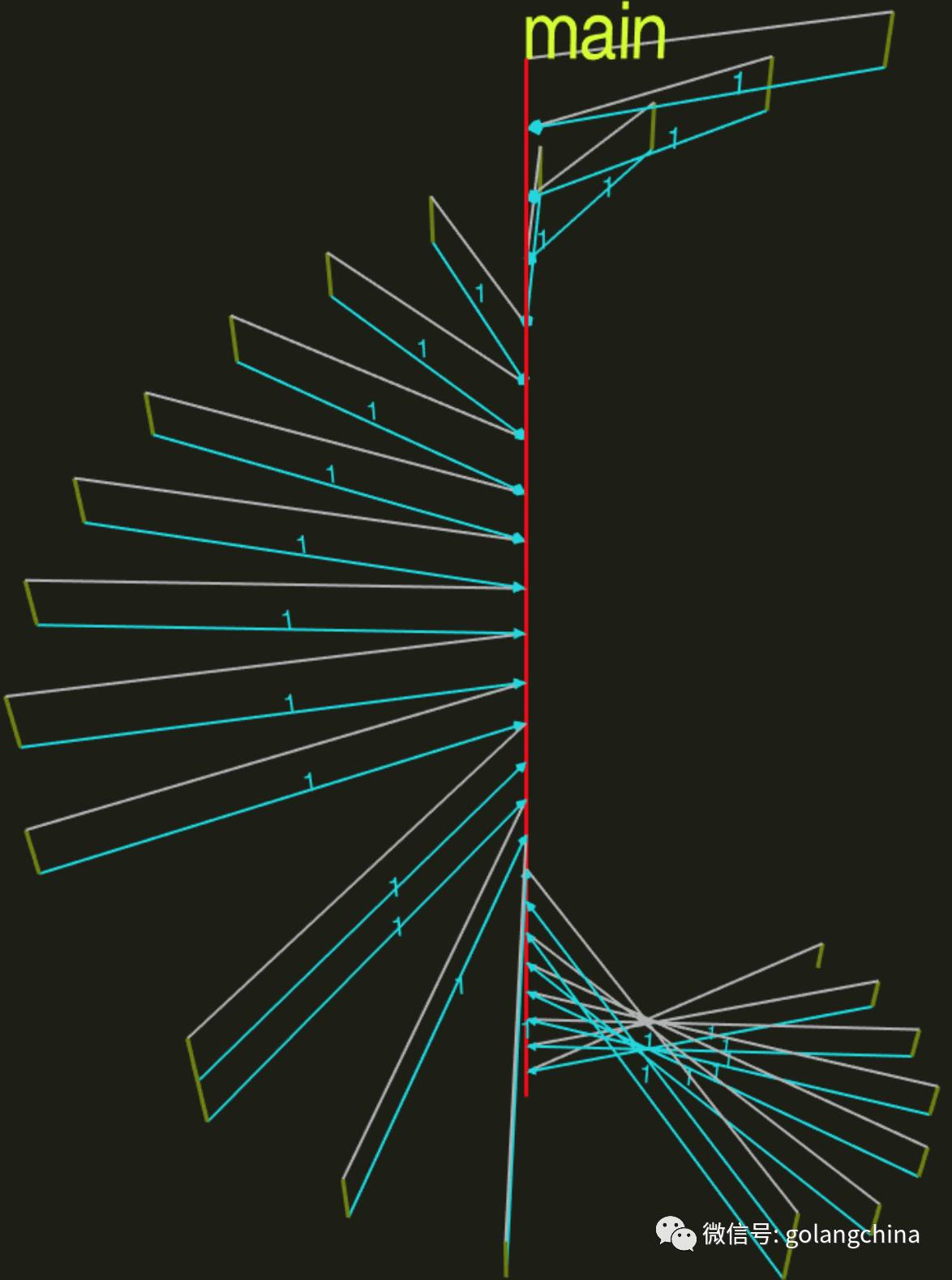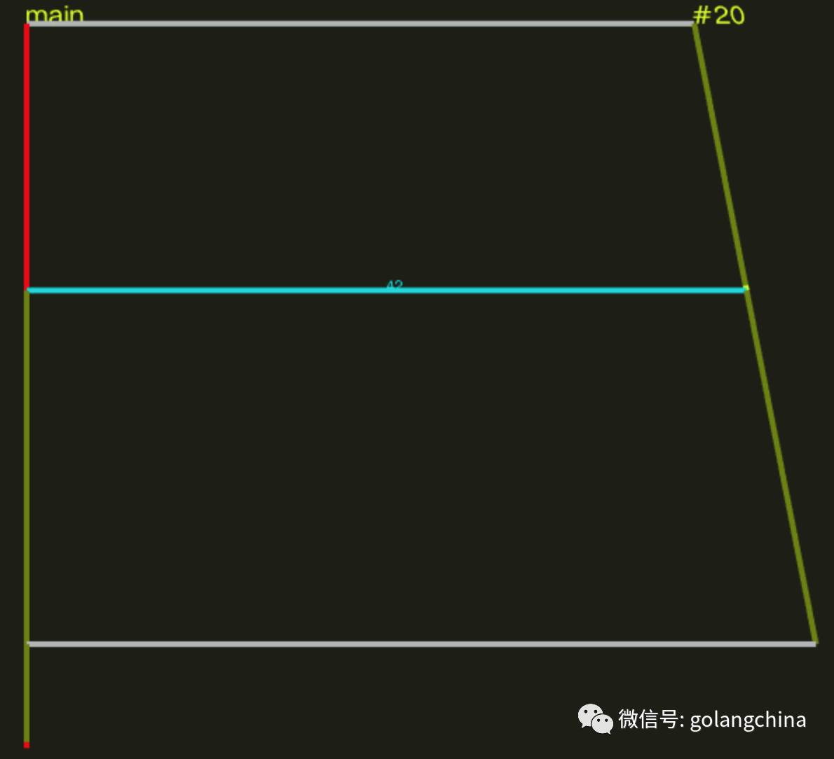 这里蓝色的线表示 goroutine 随着时间运行。细的蓝线连接了 ‘main’ 和 ‘#20’,标志着 goroutine 的启动和停止,揭示了它们的父子关系。最后,红色箭头给我们展示了‘发送/接受’的动作。实际上它是两个独立的动作,我试着用动画展示成一个单独的事务:从 A 发送到 B。 Goroutine 名称中的的 “#20”,是实际的 goroutine 内部 ID,通过某种手段从运行时获取。