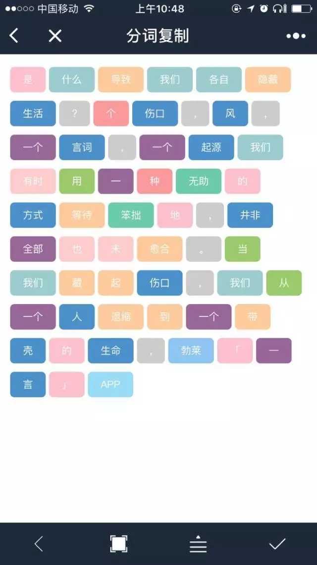 跟锤子手机的交互有点差别,但是整体效果是差不多的,将一段话包含的词语拆散分布,你可以有选择性地挑出部分内容,为你所用。