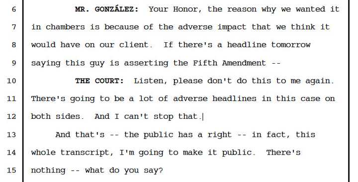 「听着,别再跟我玩这套了,」他说。「这样你们双方都会上负面报道,我可阻止不了。公众有知情权,」随后就是 Alsup 招牌的转折,「实际上,这不是有全程笔录吗?我会把它公开。」