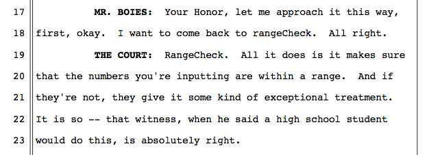 很难想象一个没有 Alsup 这样长年编程经验的法官能给出这样一份意见。显然,在对 rangeCheck 这著名的九段代码做出判决的过程中,Alsup 的背景帮了他的忙。