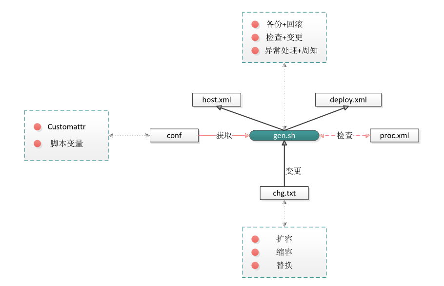 以上就是在现有的基础脚本上就行了包裹转换,现在飞车的配置生成,是全量生成,前后两个版本的文件无法对比,运维每次扩容后要小心翼翼的去对比操作。这种扩容风险实际上还是比较大,因此增量更新脚本就应运而生了,增量更新脚本集成了扩容、缩容和变更的所有操作,运维只需要专心维护gen.sh脚本即可。具体如图所示(nosea画):