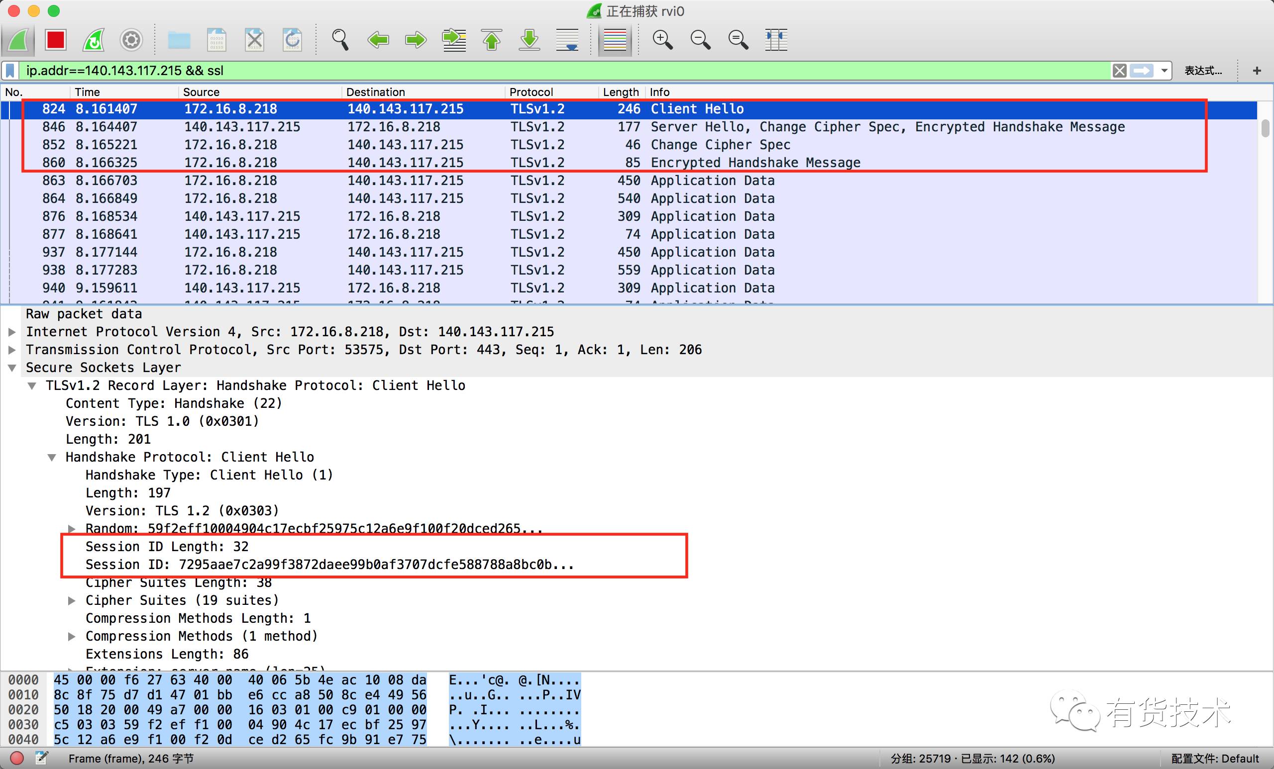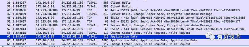 使用Wireshark对有货APP进行抓包,可以看到HTTPS请求第一次连接情况,如下图: