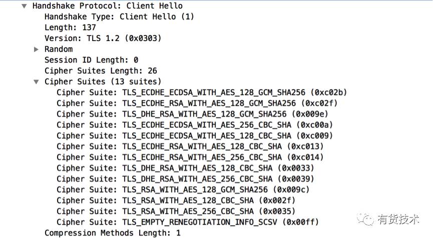 为了兼顾安全性和性能,有货APP获取服务端与客户端约定的协议列表,优先选择ECDHE-RSA-AES128-GCM-SHA256作为后续使用的协议。