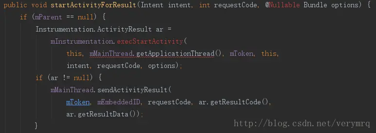 一、前言 最近看《Android开发艺术探索》大多涉及到源码解析,仅仅看书有点云里雾里,于是配合着源码一起看感觉清晰许多。网上很多推荐source insight看源码,下来之后体验感觉一般,还不如AS直接看。老罗有专门的源码查看教学,但是需要Linux(Ubuntu)/MAC机器,暂时没条件以后考虑(老罗讲的比较深入,值得长期跟)。总之还是在AS里看(求推荐),强烈推荐浏览本文时和着源码。 二、源码解析 1、startActivityForResult