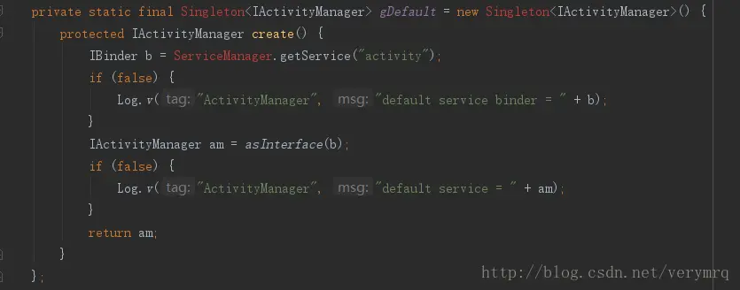 是一个单例对象,看到asInterface很熟悉(不熟悉的可以参考我的另一篇博客Android多进程IPC机制——binder原理探索)