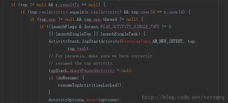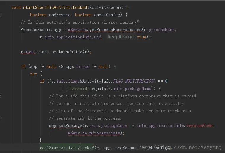 这里调用了startActivityLocked,而startActivityLocked里面又调用了startActivityUncheckedLocked,这个方法非常长,当时我是看晕了。这里我贴上关键代码。 经过一系列判断,调用了resumeTopActivitiesLocked方法,resumeTopActivitiesLocked里转给了ActivityStack的resumeTopActivityLocked方法。(这里其实可能调用ActivityStack的startActivityLocked方法,不过最终都会走到resumeTopActivityLocked)。在resumeTopActivityLocked内部又调用自己的resumeTopActivityInnerLocked方法,然后又回调了ActivityStackSupervisor的startSpecificActivityLocked方法: