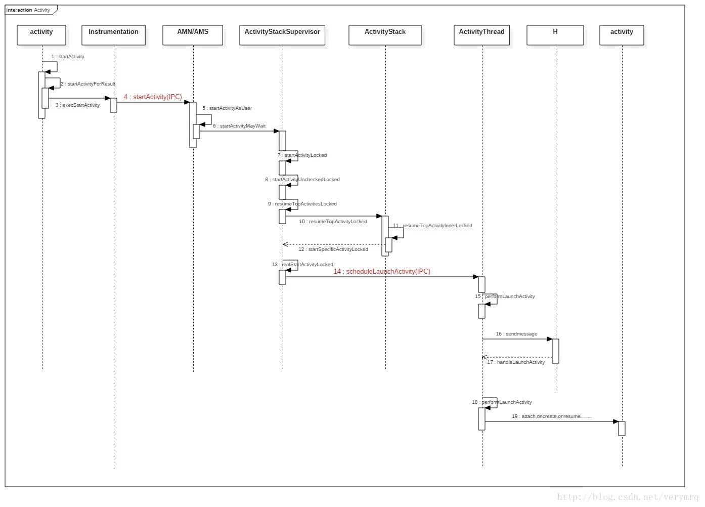 到这里,我们就理通了Activity的启动过程,主要还是利用IPC传递信息。 最后我推荐大家看源码时一定要做笔记,可以的话最好画图来帮助自己理清思路,不然会完全懵逼的。我目前使用startUML来画时序图,下面贴一张图。