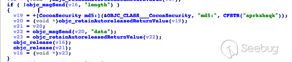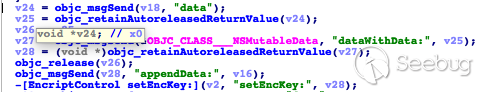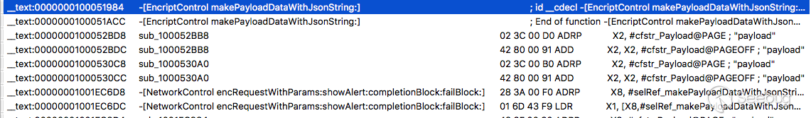 如上文所述,设备出口流量监控结果显示,所有请求均包括一个载荷。在IDA中搜索字符串后发现多数请求参数在[NetworkControl encRequestWithParams:showAlert:completionBlock:failBlock:] 方法中设置。