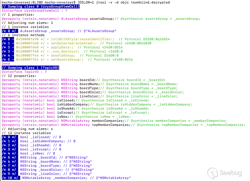我们可以通过jtool - JCOLOR=1 jtool -v -d objc teamblind.decrypted的 objc 选项转储类与方法。