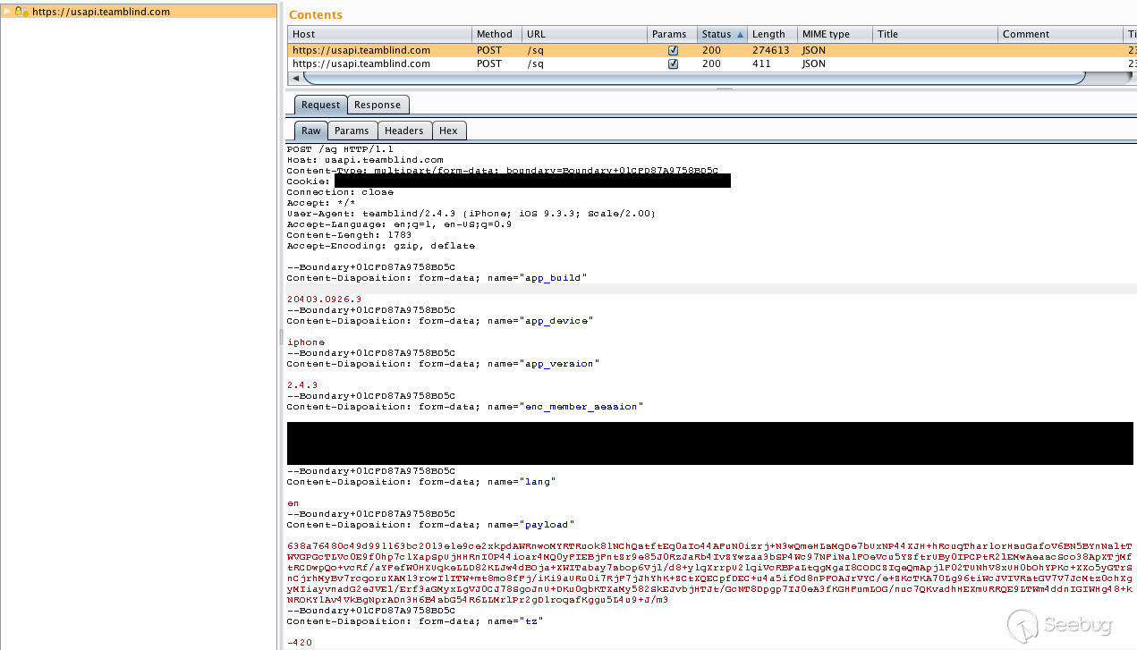 也可以用它获取其他潜在目标列表。于是,启动Burpsuite并检查流量。如前文所述,Blind应用能否实现证书固定并没有那么重要,因为该应用对发送至后端的数据进行加密。下图为常用请求示例。