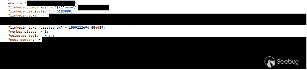 应用设置可在com.teamblind.blind.plist中查找,具体位置在 /private/var/mobile/Containers/Data/Application/<app_id>/Library/Preferences/com.tea mblind.blind.plist。此时,检查文件就会发现其中包含明文电子邮件以及登录时填写的公司信息。可以使用plutil实用程序读取文件。