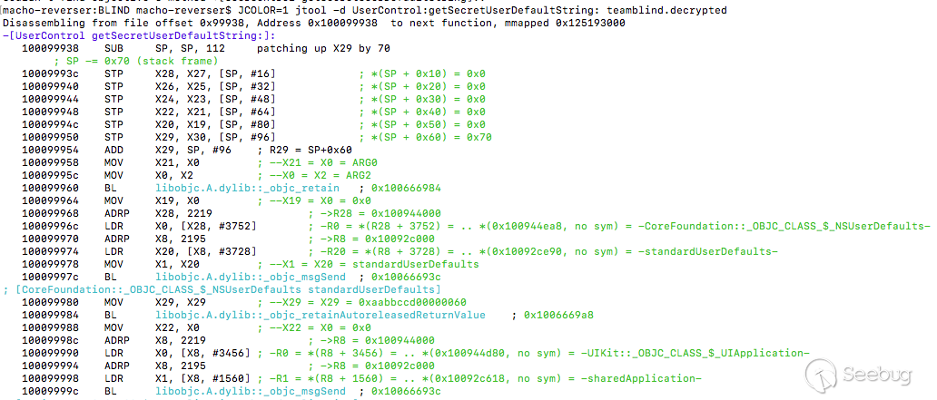 还需要说明一点,虽然本文使用IDA,读者完全可以根据自身反汇编需要使用jtool,例如研究某个特殊类时输入jtool -d UserControl:getSecretUserDefaultString: teamblind.decrypted。