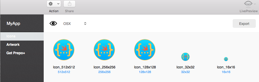 制作一个1024*1024的图片,我习惯使用pixelmator,个人感觉比较简单上手,然后生成若干张对应尺寸的图标,这种app有很多,我用的是Prepo