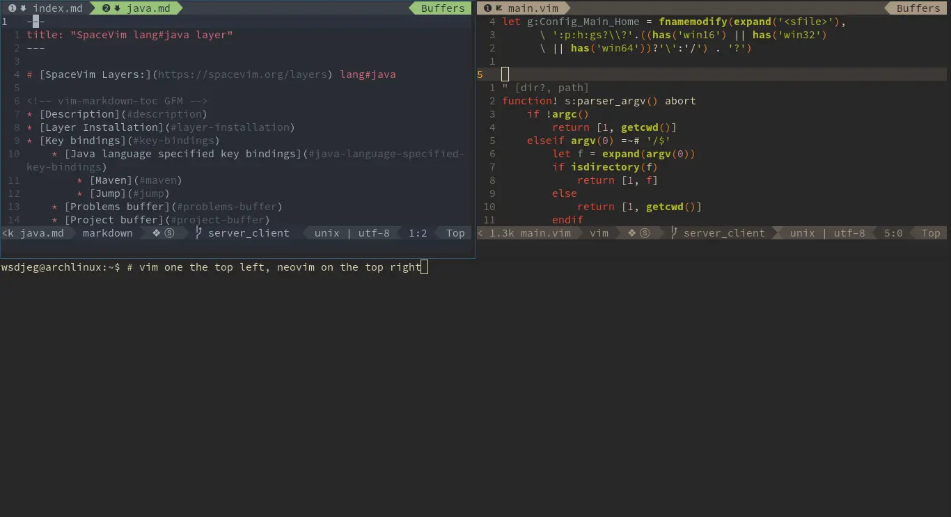 屏幕中是三个终端,左上为 SpaceVim 运行与 neovim 上, 右上为 SpaceVim 运行与 vim 上,这里演示的是,通过命令将文件发给SpaceVim,使其编辑某个文件,而不需要在打开多余的 vim 窗口。