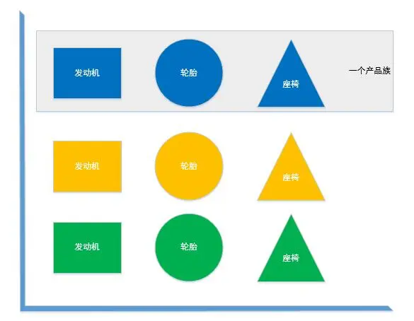 在上图中,有多个发动机、轮胎和座椅,它们都可以看作是单独的产品,我们将发动机、轮胎和座椅组成一个产品族,用于区分其他的发动机、轮胎和座椅。