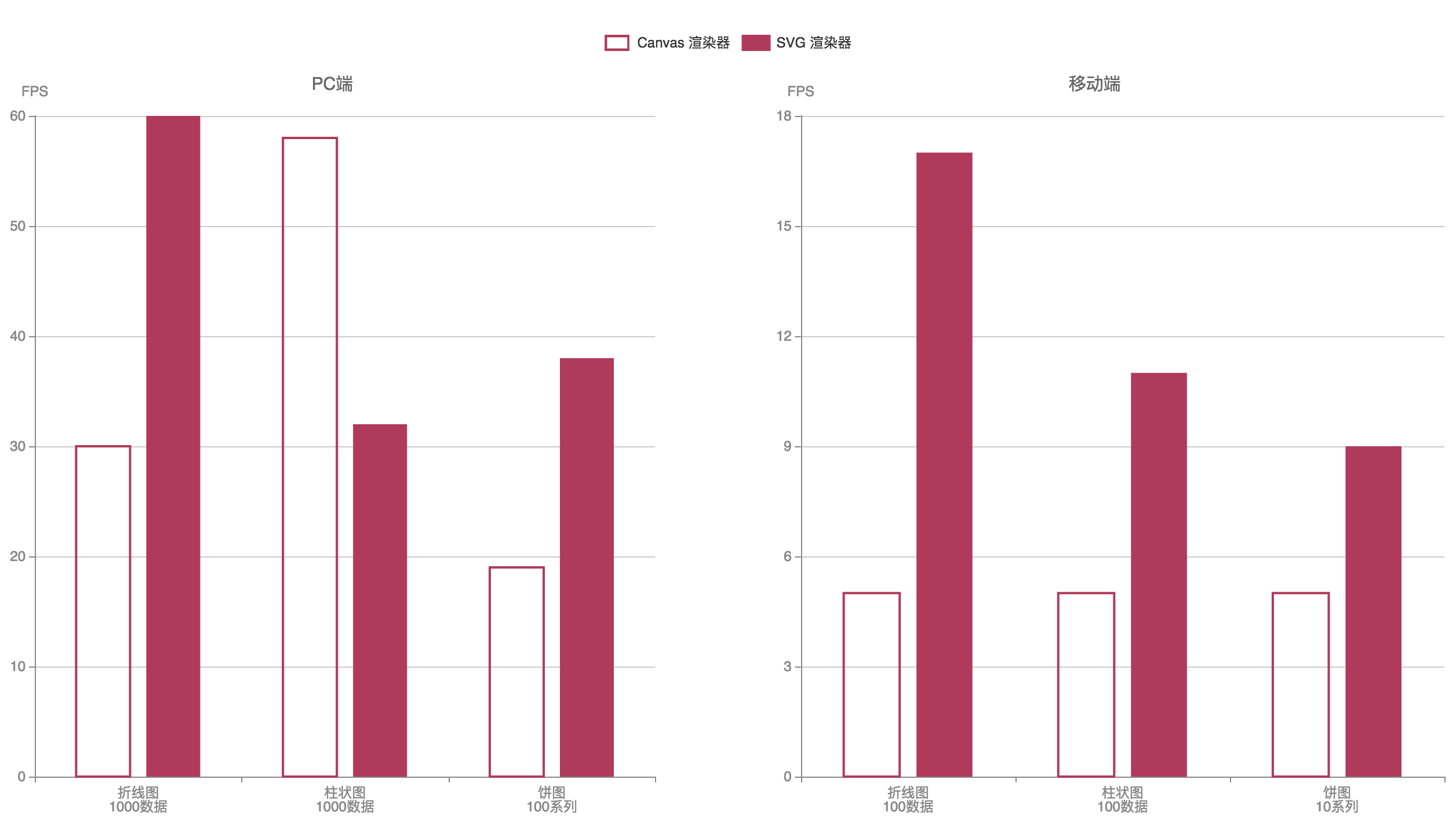一般来说,Canvas 更适合绘制图形元素数量非常大(这一般是由数据量大导致)的图表(如热力图、地理坐标系或平行坐标系上的大规模线图或散点图等),也利于实现某些视觉 特效。但是,在不少场景中,SVG 具有重要的优势:它的内存占用更低(这对移动端尤其重要)、渲染性能略高、并且用户使用浏览器内置的缩放功能时不会模糊。例如,我们在一些硬件环境中分别使用 Canvas 渲染器和 SVG 渲染器绘制中等数据量的折、柱、饼,统计初始动画阶段的帧率,得到了一个性能对比图: