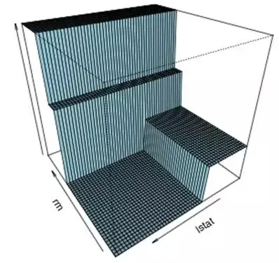 我们可以将树模型看作是将特征空间分割成几个不同的矩形和非重叠区域集合,然后它可以拟合一些简单的模型。下图给出了使用 Boston Housing 数据得到的可视化结果: