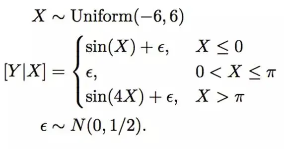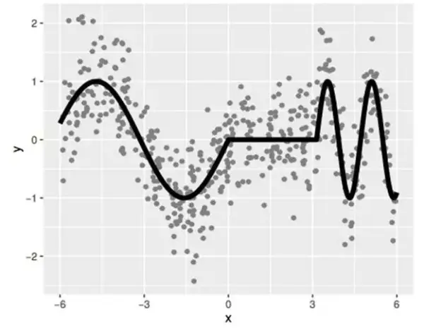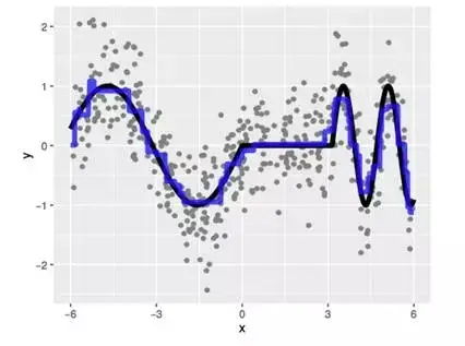 提升树模型(boosting tree model)是多个树 fm 的和,所以也被称为树集成(tree ensemble)或叠加树模型(additive tree model)。因此它比单个树模型更加平滑,如下图所示: