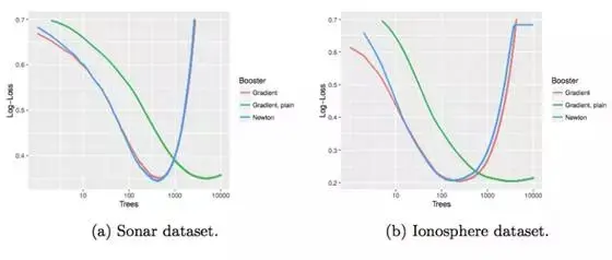 尽管如此,该论文的作者在两个标准数据集上对它们进行了测试:Sonar 和 Ionosphere(Lichman, 2013)。这个实证比较使用了带有 2 个终端节点的树,没有使用其它正则化,而且这些数据也没有分类特征和缺失值。梯度树提升还加入了一个线搜索(line search),如图中红色线所示。