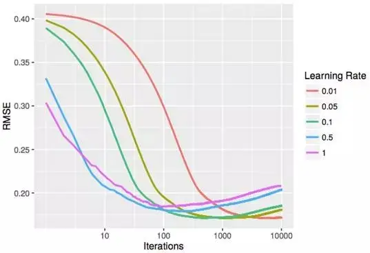 在 Boston Housing 数据集上的不同学习率的样本外(out-of-sample)RMSE