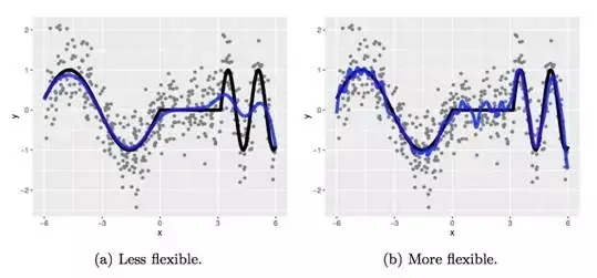 然后使用局部线性回归(使用了两种不同灵活度的拟合)来拟合它:
