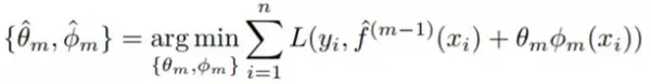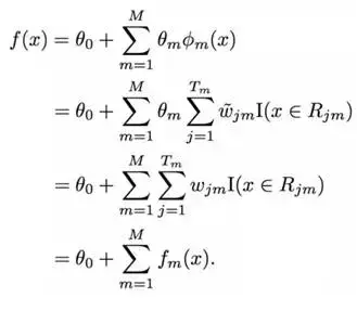 其中 f_0(x)=θ_0 且 f_m(x)=θ_m*Φ_m(x),m=1,…,M,Φm 是按顺序累加的基本函数,可用于提升当前模型的拟合度。
