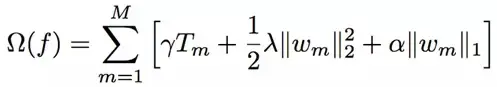 其中第一项是每个单个树的终端节点的数量,第二项是在该项权重上的 L2 正则化,最后一项是在该项权重上的 L1 正则化。