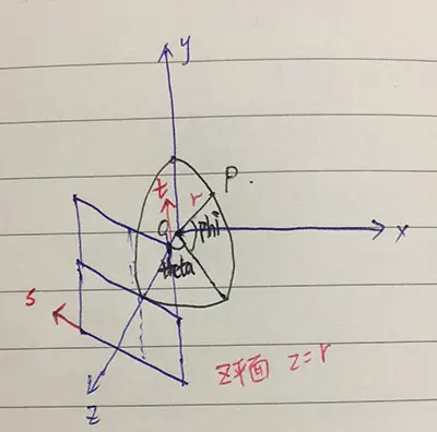 假设点P是从球面和Z轴的交点绕Y轴旋转theta,然后在Y轴和其本身组成的平面上绕其过原点的法向量旋转phi得到,那么点P的坐标如下: