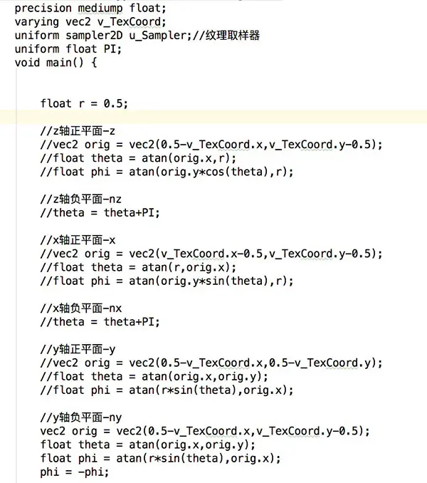 float t1 = phi/PI*2.0*0.5 + 0.5;整个推导过程就可以理解为点Q(s0,t0)为立方体全景图z轴正平面的点,对应到二维球型全景图中的坐标为(s1,t1);