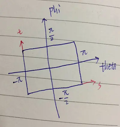 之所以求出theta和phi的值是因为可以通过这两个值把球型全景图转换为二维;示意图如下: