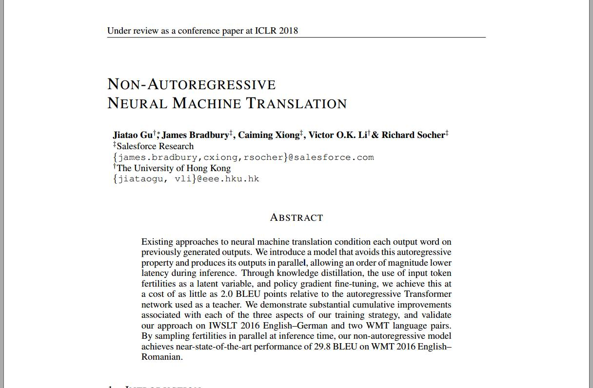 Salesforce研究院去年了成立研究院,之后又发布其人工智能服务Einstein AI。该研究院在自然语言处理,尤其是翻译方面取得了很多成绩,雷克世界此前曾对其「通过情景化词向量从翻译中学习」(mp.weixin.qq.com/s/3GndUC9-8…)进行过报道。近日,他们有推出了令人振奋的科研成果,他们通过全并行的文本生成,用于神经机器翻译。