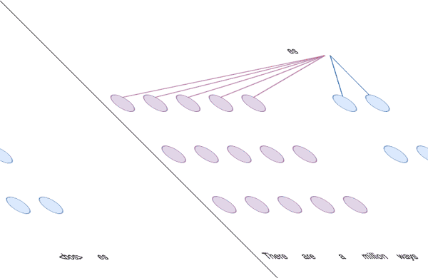 先前的神经机器翻译模型和我们的新的非自回归模型之间的区别,可以用以下两个动画来进行表示。紫色圆点代表“编码器1”中的神经网络层,“编码器1”是一个用以理解和解释输入句子(此处指的是英文)的网络;蓝色点代表“解码器2”中的层,其工作是将这种理解转换成另一种语言(此处指的是德语)表示的句子;而彩色的线代表层之间的注意连接,使得网络能够将句子不同部分的信息结合在一起。请注意,两个模型中的紫色编码器层可以同时运行(动画的第一部分,用密集的红色注意连接),而第一个动画中的蓝色解码器层必须在一次处理一个单词,因为在解码器开始产生下一个之前,每个输出单词必须做好准备(见棕色箭头)。