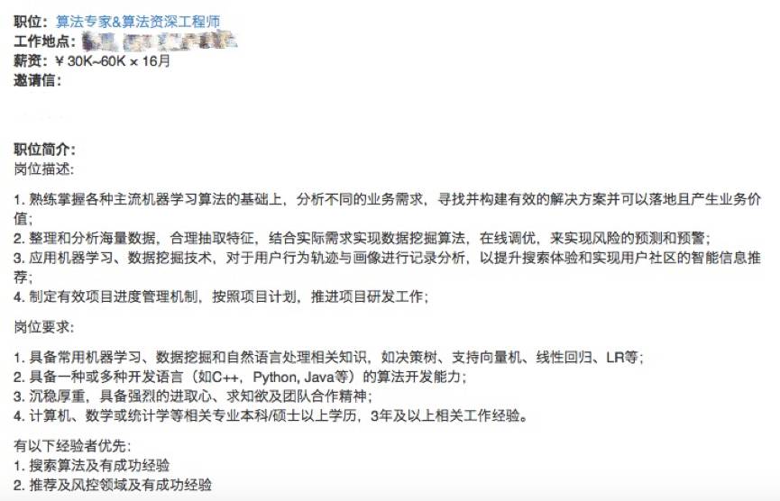 这是 100offer 上,某 BAT 发给算法工程师的面试邀请JD,从这份 JD 可以看出,资深算法工程师的普遍要求是 3 年以上工作经验,提供 30k-60k 的基础月薪。在岗位描述中主要介绍了具体的业务场景,其实主要做的还是数据挖掘和搜索相关工作。在岗位要求中,罗列了一些常见的机器学习技术,并对编程开发的能力有较高的需求。