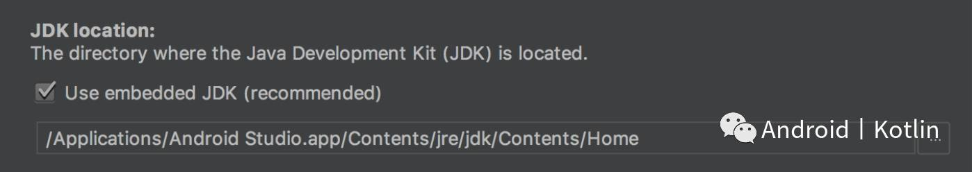 在 Android Studio 中,为了使用 Kotlin,你需要添加 JDK。没有一个独立于 JDK 的 KDK 可以供 Kotlin 来使用。