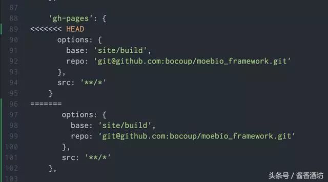 一般在merge之后,会出现conflict,需要针对冲突情况,手动解除冲突。主要是因为两个用户修改了同一文件的同一块区域。如下图所示,需要手动解除。
